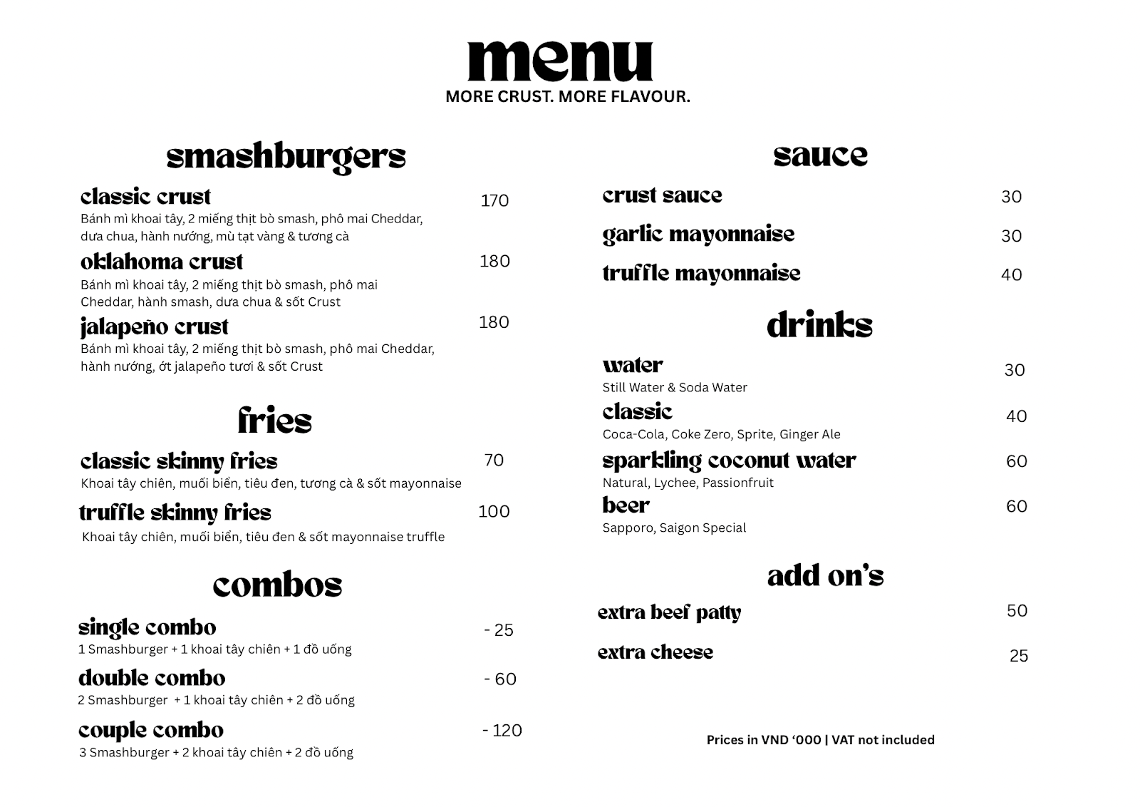 - crust smashburger is considered moderately priced for the Thao Dien area. It is a popular hamburger restaurant suitable for quick bite, lunch, burgers.