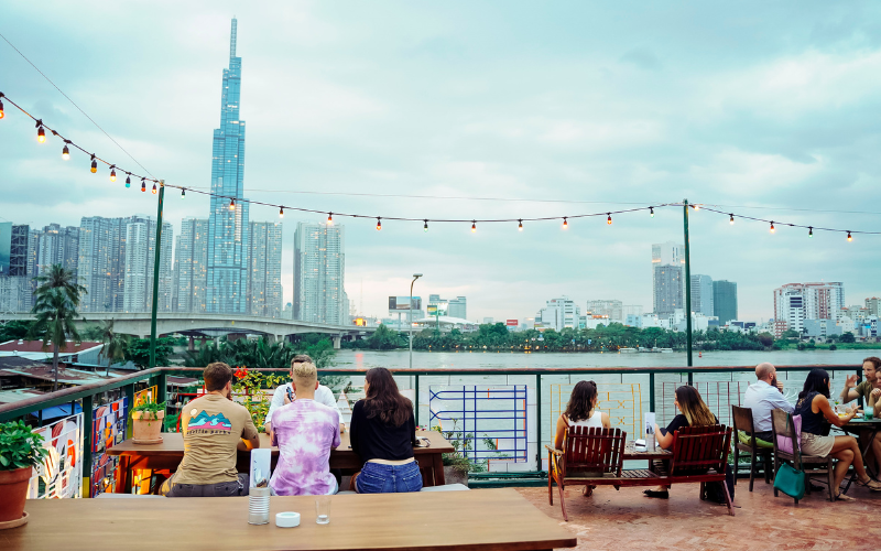 Wonderful rooftop setting with views of the river and Landmark 81. Belgian and French beers on tap, plus a selection of bottled options. Good variety of cocktails. It feels about 80% frequented by foreigners.
